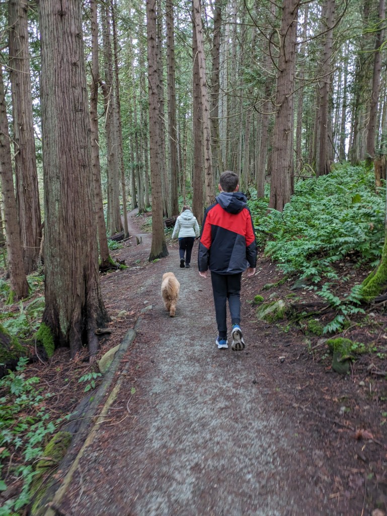 Walking with Oscar in the woods at Deep Cove, Vancouver Island