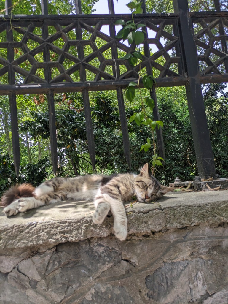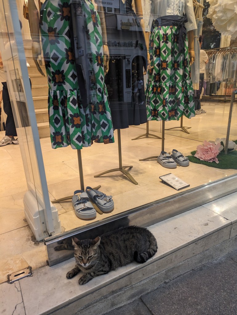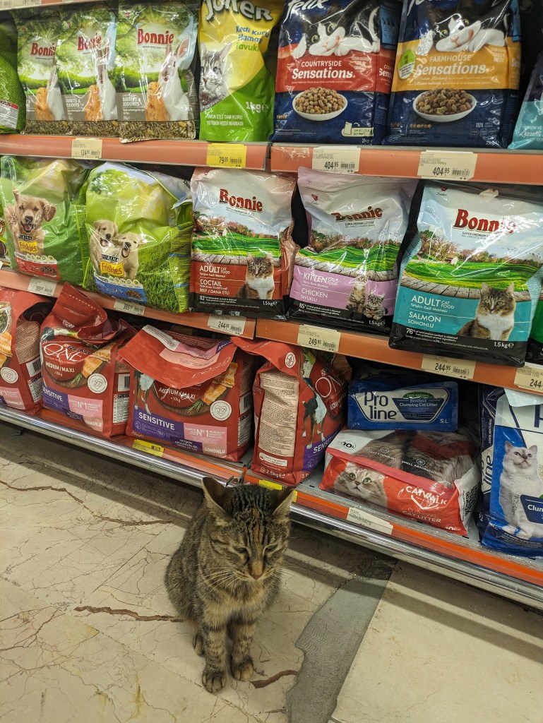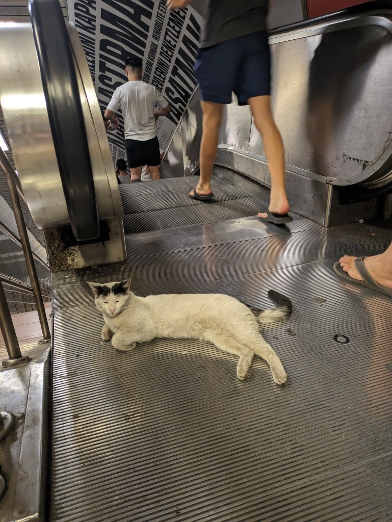 OK, so for the cat lovers here, this is your city. The city of Istanbul has 150,000 stray cats that are very well cared for by the community. Cats are sacred in the Muslim religion and also there are theories that in the Ottoman period cats were revered because they drove out the disease-carrying rats, but whatever the reason, it’s a pretty entertaining sight. They are everywhere, and most are super friendly and healthy. There are some paid city employees to care for the cats, including vets to spay/neuter them, but many of the locals also carry around cat food, and/or leave food/water outside of their home or business for the cats. There are little cat houses everywhere, and the cats act like the city is a giant living room built just for them. Some photos of cat sightings in this slideshow below (click arrows to scroll through photos):