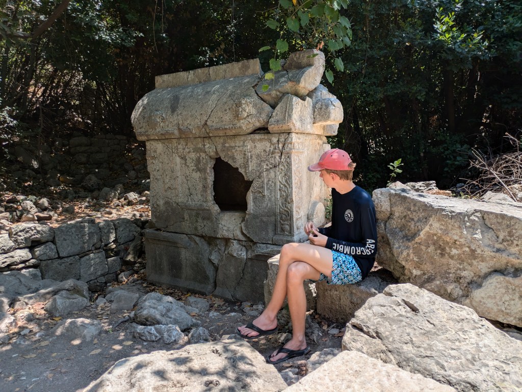Of course we can’t just sit on a beach all week…. so we did lots of activities in the area as well. It’s an amazing place for interesting sights, as I understand most of Turkey is. Just a walk down the beach were the ruins of the ancient city of Olympus which dates back to the 4th century BC. The city was abandoned in the 15th century and only excavated starting in 1990. We were able to climb right up and through the ruins, very cool.