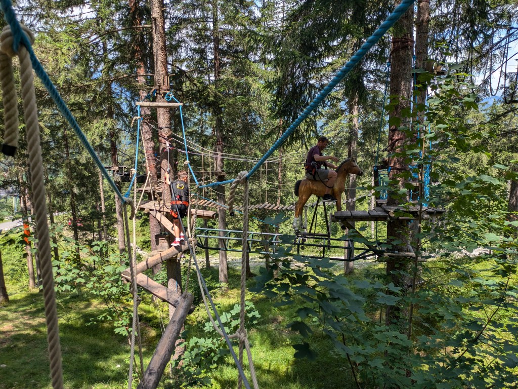 We also tried out a ropes course up on one of the mountains at “Kletterwald” and the two younger kids also went to a climbing gym. The area is also great for running so we got out for a couple of runs as well – one run we went right by the old bobsled course from the 1936 Olympics. And of course there was lots of soccer – a number of games in fact – but the sad news of the week is that the soccer ball we have been travelling with since February has officially died. Apparently Lucas has too strong of a kick 🙂